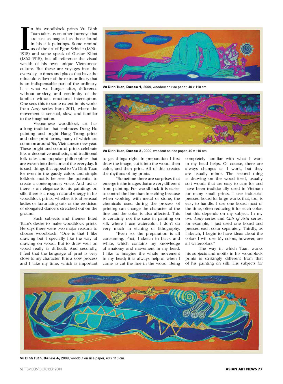 Ngày nay tranh khắc và tranh lụa không còn phổ biến như trước kia. Đối với Vũ Đình Tuấn, một họa sỹ Việt Nam giàu kinh nghiệm, các biểu hiện nghệ thuật luôn là tâm điểm trong các tác phẩm giàu cảm xúc của anh. Những bức tranh khắc gỗ đùa giỡn với bóng và hình như thể chúng đang trong một điệu vũ gợi cảm và những bức tranh lụa về những khuôn mặt gợi lên vẻ đẹp siêu thực nhẹ nhàng và tràn đầy những câu chuyện mộng mị.